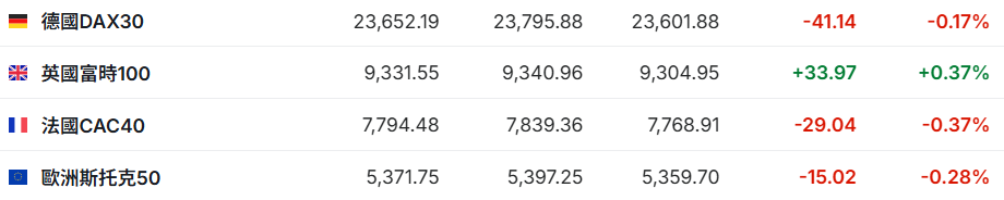 2. 截至发稿,德国DAX指数跌0.17%,英国富时100指数涨0.37%,法国CAC40指数跌0.37%,欧洲斯托克50指数跌0.28%。